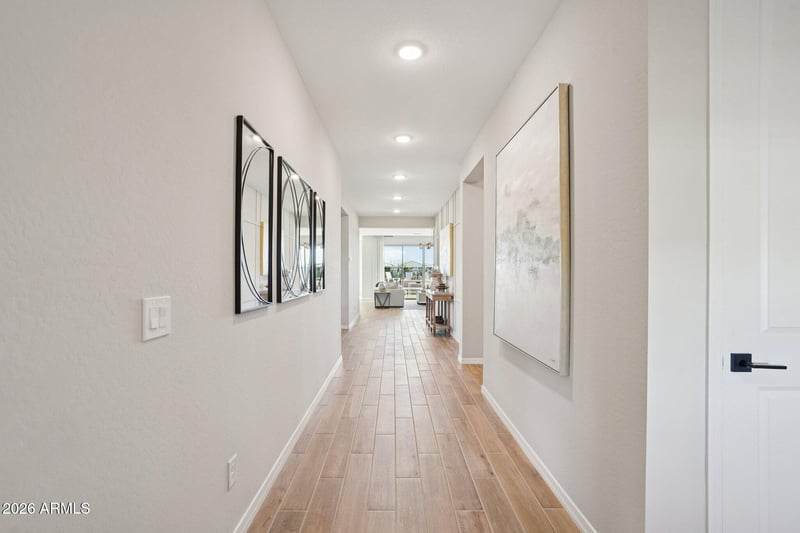 Listing details for 2551 Homesteader Rd, San Tan Valley, AZ 85140 : Model Home for Sale! Model furniture available to purchase in addition to list price. Nestled in the heart of San Tan Valley, this 2,485-square-foot Topaz home offers three bedrooms, two and a half bathrooms, a den, and a spacious three-car tandem garage. Upon entry, you are greeted by a wide main hallway and a large foyer with convenient closet space. The open-concept design seamlessly flows into the heart of the home, where you'll find 8-foot doors and a striking 4-panel glass slider. The sliding doors open to a private backyard retreat, offering the perfect space for relaxation.