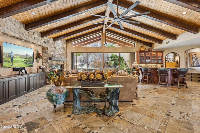 Listing details for 25572 113th Way, Scottsdale, AZ 85255 : Unmatched views. Irreplaceable setting. A rare opportunity! Perched on a private hillside in Scottsdale's Troon Village with commanding vistas of Troon Mountain and the Four Peaks, this home delivers a level of luxury and exclusivity that is simply not being replicated at this price point. Spanning 5,500+ square feet, this Italian-inspired estate was built for those who demand both sophistication and presence. Expansive living spaces, soaring ceilings, and walls of glass frame breathtaking desert views--creating a daily experience that feels like a private resort. The kitchen and great room were designed to impress, flowing effortlessly into a full bar and entertainment space ideal for hosting at any scale. Disappearing glass doors open to a backyard that rivals five-star resorts--complete with a heated pool and spa, dramatic rock waterfall, outdoor fireplace, and built-in BBQ. This is Arizona living at its absolute peak. The split floor plan offers privacy and flexibility, anchored by a luxurious primary retreat with dual closets and a private fitness space. Ensuite guest rooms, a dedicated executive office, home theater, and a 500+ bottle wine room elevate this home into a true entertainer's estate. With an elevator, climate-controlled garage, and recent system upgrades already completed, this home delivers both convenience and peace of mind--making it ideal as a full-time residence or lock-and-leave luxury escape. Homes with this combination of views, privacy, scale, and upgrades in Troon are exceptionally limited.