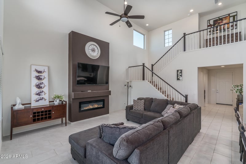 Listing details for 25642 163rd Dr, Surprise, AZ 85387 : Situated on a premium corner lot at the end of a quiet cul de sac and backing to open desert, this original owner home offers generous space with four bedrooms plus a den and two and a half baths in 2821 square feet. The open great room features a cozy fireplace and soaring cathedral ceilings, complemented by an upstairs loft for added flexibility. The kitchen impresses with espresso maple cabinetry, quartz countertops, stainless appliances, and an island with a breakfast bar and pendant lighting. A stylish dining area with a custom wall treatment opens to the covered patio, creating an easy flow for indoor and outdoor entertaining. The private backyard overlooks a peaceful desert wash and includes artificial turf for play along with an additional paver patio. The main level primary suite offers a dual sink vanity, oversized shower, and walk in closet, while secondary bedrooms are tucked upstairs. Additional highlights include a convenient powder room for guests and a two car garage with an attached bonus room.
