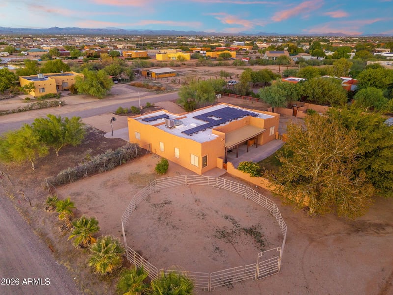 Listing details for 25645 Blue Sky Dr, Wittmann, AZ 85361 : Wide-open, fully usable 1.3 acre desert living with SOUTHERLY MOUNTAIN VIEWS, limitless potential for recreation and EQUESTRIAN LIVING w/2 HORSE STALLS and water access, 50 FT ROUND PEN, impressive COVERED RV PARKING with 50 amp electrical and water hookups ideal for guests, travel or rental income opportunities, TWO 40 FT SHIPPING CONTAINERS with electricity great for storage and/or work space and TUFF SHED with overhead storage. Enjoy the fully fenced FIBERGLASS POOL with brand NEW COLOR-CHANGING LED POOL LIGHT in 2024 and convenient 6-ZONE IRRIGATION SYSTEM keeping the grass and plants vibrant year-round. Surrounded by MATURE PALM TREES, this FULLY FENCED PROPERTY has TWO RV GATES for easy access for toys, trailers, RV's and OF COURSE, NO HOA! Step inside and appreciate the 9FT CEILINGS, NEW INTERIOR PAINT IN 2025 for a fresh clean finish. Appreciate the NATURAL LIGHT from big windows, french doors and thoughtfully placed skylights. Two way kitchen access with oversized peninsula island barstool seating that open flow to the breakfast nook and living room. Note the NEW STAINLESS STEEL APPLIANCE PACKAGE including new Samsung refrigerator, new Fridgidaire dishwasher, new microwave and oven and new garbage disposal all installed 2025. ENERGY EFFICIENCY takes center stage with SUN POWER SOLAR PANELS on year 13 of the agreement at $147/month which keeps ELECTRIC BILLS AVERAGING JUST $25-$30/MONTH! More exterior upgrades include NEW RAIN GUTTERS in 2025 and a RESEALED ROOF in 2024, custom petrified wood focal point enhancing the curb appeal, SEMI-CIRCLE DRIVEWAY for EXTRA PARKING and built in basketball hoop. Enjoy the peaceful evenings on your private land with front and back covered patios ideal for morning coffee or stargazing under the desert skies. Residents of Wittmann enjoy bringing their horses, trailers, and toys with direct State Land access for endless riding and outdoor recreation. Located within the NADABURG UNIFIED SCHOOL DISTRICT and just a short drive from Surprise, Peoria, and Wickenburg, offering convenient access to shopping, dining, and entertainment.
