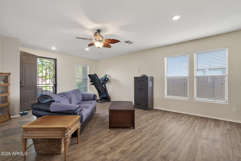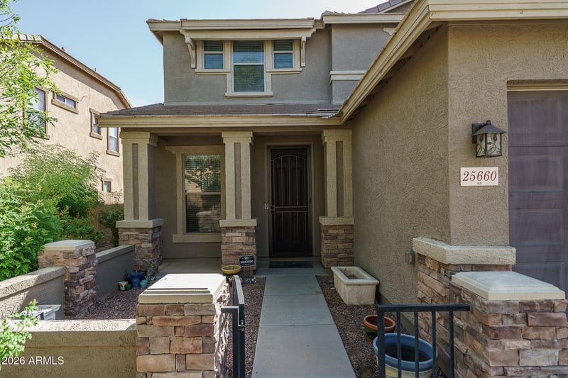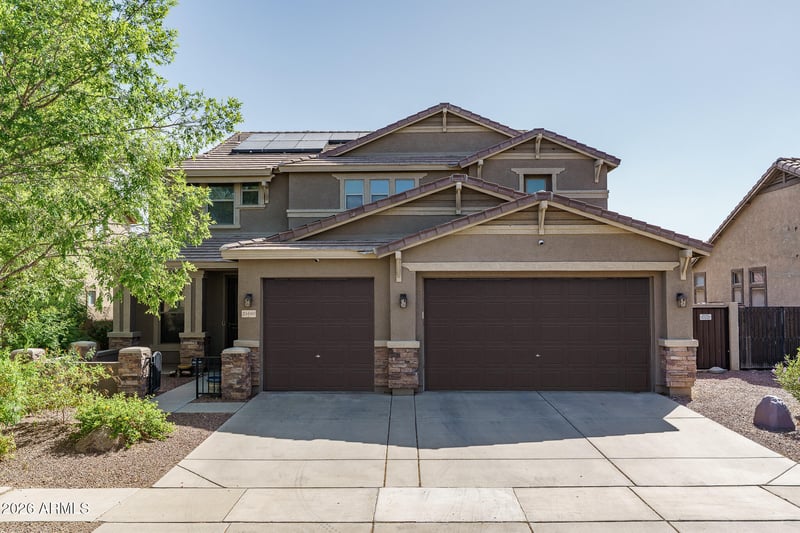 Listing details for 25660 Desert Mesa Dr, Surprise, AZ 85387 : Welcome to this spacious home in Desert Oasis with 4 bedrooms plus a den with double doors & 2.5 baths in 3367 SqFt. Floor plan includes a front living room and separate family room open to the kitchen. The kitchen has an abundance of cabinets, granite counters, stainless appliances, a center island and an additional island with breakfast bar. The backyard has an extended covered patio with ceiling fans, sparkling pool with water feature and grass for kids & pets to play on. The bedrooms and laundry are upstairs. The primary has an en-suite with double sinks and custom tiled shower with multiple shower heads. Other features include stone exterior elevation, and a 3-car garage.