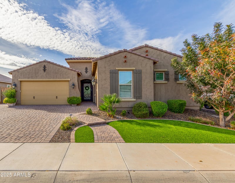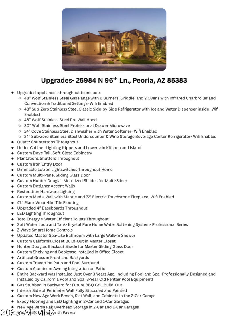 Listing details for 25984 96th Ln, Peoria, AZ 85383 : Prepare to be amazed! Check out this fantastic 3 bed, 2.5 bath home now available in Querencia! Great curb appeal, beautiful landscape w/artificial turf, 3 garage spaces, and a paver driveway. Discover a spacious open floor plan w/high ceilings, wood-look tile flooring, plantation shutters, and a 72'' fireplace. The gourmet kitchen is comprised of ample dove-tail, soft-close cabinetry w/crown moulding, a walk-in pantry, quartz counters, tile backsplash, Wolf/Sub-Zero/Cove SS appliances, pendant lighting, and large island. The primary suite showcases direct outdoor access, a custom walk-in closet, and a private bath w/dual sinks plus a sliding barn door. Don't forget about the sizeable den, ideal for an office. See upgrade list in photos. Lastly, the wonderful backyard includes a covered patio, extended seating area w/an attached pergola, and a refreshing pool/spa combo! Don't miss out!
