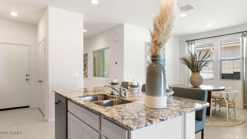Listing details for 25993 Lynne Ln, Buckeye, AZ 85326 : MOVE IN READY! Brand new home. This Caden floor floor pan features open concept with 3 bedrooms, 2 baths, It includes many upgrades like quartz kitchen countertops, 6x24 plank tile in wood-like colors included in all traffic areas, including living room and hallways. The bedrooms feature plush, upgraded carpet. Enjoy the covered patio in the backyard for a serene outdoor retreat. Window Blinds, Wifi Garage Door Opener, Front yard Landscaping with irrigation system, and State of the Art Smart Home Technology included!