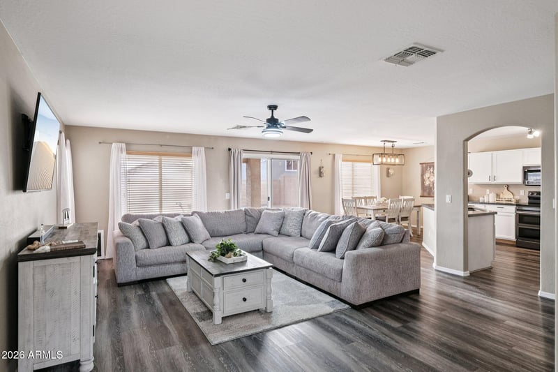 Listing details for 26 224th Ave, Buckeye, AZ 85326 : This spacious turn-key home offers flexible living and room for everyone! The main level features a bright open great room and kitchen with eat-in dining, plus a full bedroom and bathroom, a large laundry room, and storage under the stairs. Upstairs includes a private primary suite with dual sinks, walk-in and storage closets, two secondary bedrooms (one with a walk-in), a full bath, and a large loft ideal for work or play. Updates include premium laminate flooring and carpet, updated lighting, land/hardscaping, and a security door. Located in the master-planned community of Sundance, just minutes from I-10, shopping, dining, and entertainment. Buckeye continues to grow with new developments, expanding retail, and outdoor attractions! Don't miss your chance to see it!