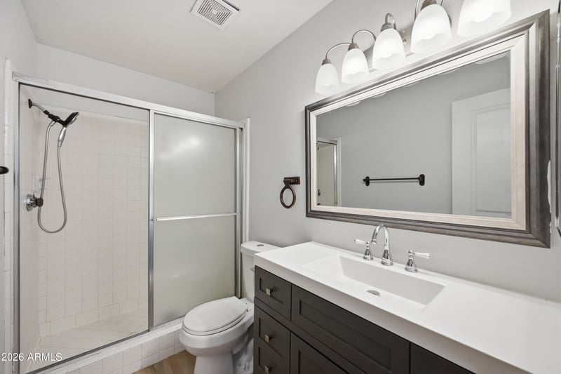 The hall bathroom features an updated vanity with solid surface countertop, modern sink, updated lighting, and contemporary mirror. The second bathroom includes a shower enclosure and functional layout.