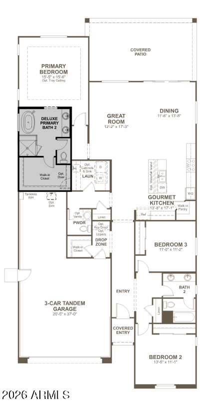 Listing details for 260 Rock Needle Trl, Apache Junction, AZ 85120 : Welcome to Portfolio at Blossom Rock and the Alden plan! This home boasts 2050 sq. ft. of meticulously crafted living space. With three bedrooms and two and a half baths, every corner of this home is designed with purpose. The kitchen features quartz countertops, upgraded white shaker cabinets, and a central island that doubles as a culinary hub and gathering place. The owner's suite has a large bathroom with a double vanity, an elegant stand-alone tub, a tiled shower, and offers an over-sized walk-in closet. Outside, a 3-car tandem garage offers ample storage for vehicles, outdoor gear, and more, ensuring both convenience and practicality. With amenities like a tankless hot water heater for efficiency and a charming paver driveway, this home harmoniously blends convenience and sophistication.