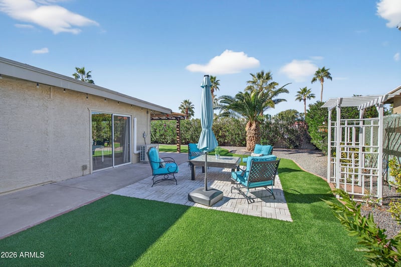 Listing details for 26026 Jardin Dr, Sun Lakes, AZ 85248 : Located in a highly desirable Cottonwood subdivision in Sun Lakes, this beautifully Maintained home offers extensive upgrades and move-in ready appeal. The remodeled kitchen has white cabinets and granite countertops with added crown molding for a finishing touch. Both the front and backyard were completely redesigned in May 2024 with turf, pavers, decorative rock, irrigation and drip system, creating a low maintenance outdoor living. A new mini-split was added to the Arizona room in April 2024 for year round comfort. The primary bathroom was fully remodeled in April 2025. Additional upgrades include new LVP flooring in both bedrooms, fresh interior paint, roof sealed with elastomeric coating. Pride of ownership throughout the home. Lots of amenities in the community.