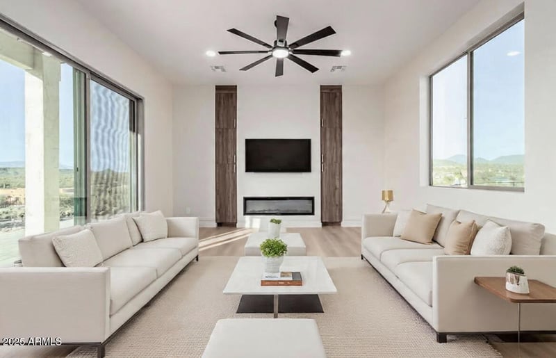 Listing details for 2605 Ute Ct, New River, AZ 85087 : *** TURNKEY READY Brand-new hilltop custom home with 360 degrees gorgeous mountain views Situated on a PRIME cul-de-sac and loaded with luxury custom features. Pride of ownership shines throughout this gorgeous 3-bedroom home featuring a 2-car garage & timeless stone accents! Spacious living room sets the stage for a delightful living experience, showcasing wood-look flooring, a stylish wall-mounted fireplace, & multi-sliding glass doors that open to the back patio for seamless indoor-outdoor living. Gourmet eat-in kitchen is a culinary haven, boasting a walk-in pantry, abundant cabinetry, recessed & pendant lighting, high-end SS appliances, granite counters, & a prep island with a breakfast bar. Serene main retreat offers plush carpet, balcony access, an elegant ensuite with dual sinks, & a walk-in closet. Enjoy mountain views from the balcony or unwind under the covered patio with your favorite drink. Conveniently located near Lake Pleasant, Bartlet Lake, mountain trails, shopping centers, freeways, and only a few minutes away from Prescott and Flagstaff for cooler temperatures during summer days! Hurry and see it today before it's too late!