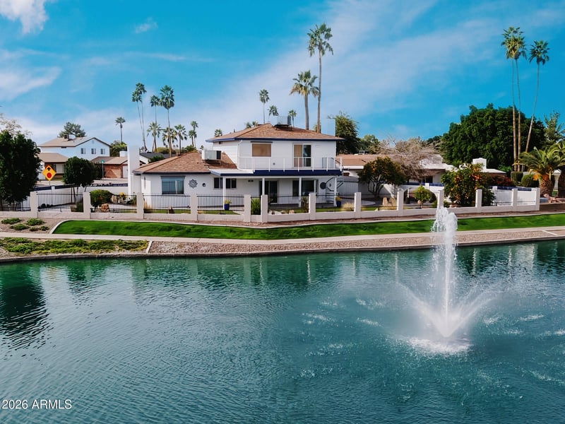 Inside, you'll find a thoughtfully updated 3 bed, 3 bath home with Energy Star appliances, dual fireplaces, and expansive windows that frame those lake views you moved here for. The wheelchair accessible downstairs layout includes a roll in shower and flexible multipurpose room with Murphy bed, perfect for guests or office. Low maintenance landscaping, energy efficient roller shades, and an awning keep things comfortable year round, while the Rhino Shield exterior means one less thing to worry about. Beyond your private oasis, Dobson Ranch delivers the lifestyle: boating, golf, pools, tennis, pickleball, dog park, and top-rated schools. Enjoy two mature citrus trees for fresh Arizona oranges. Easy access to the 101 and 60 puts you 30 minutes from both airports, but why leave when the lake is calling? Your lakefront escape awaits.