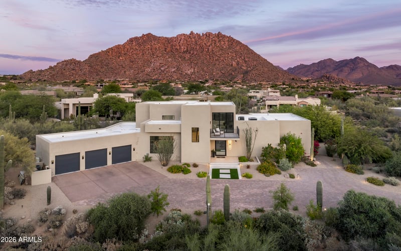 Listing details for 26101 104th Pl, Scottsdale, AZ 85255 : Situated on an oversized cul-de-sac lot within the gated Troon Fairways community, this extensively rebuilt residence offers breathtaking 360-degree views of Pinnacle Peak, Troon Mountain, and the surrounding city lights. Designed in a soft contemporary style, the 5,500-square-foot home features five bedrooms and four-and-a-half baths, blending open-concept living with thoughtful architectural detail. An impressive entry welcomes you with a striking wine room, leading into a spacious family room that flows seamlessly into the kitchen--ideal for both everyday living and entertaining. The chef's kitchen is well-appointed with quartz countertops, multiple ovens, a walk-in pantry, reverse osmosis system, and built-in recycling, combining functionality with elevated design. The primary suite offers a serene main-level retreat with privacy and comfort. Expansive viewing decks totaling approximately 1,250 square feet showcase panoramic vistas and unforgettable sunsets, while four gas fireplaces add warmth and ambiance throughout. Modern conveniences such as CAT 5 wiring enhance functionality. Outdoors, a newly completed pool and spa are complemented by charming outdoor living spaces, creating a true desert retreat in one of North Scottsdale's most desirable gated communities.