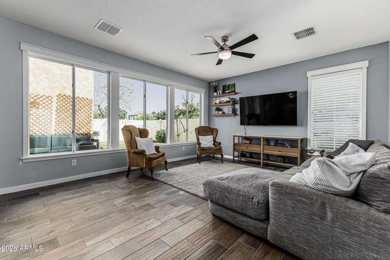 Listing details for 2614 Valle Verde --, Mesa, AZ 85209 : Home, sweet home! This charming 3-bedroom residence welcomes you with an adorable front patio perfect for morning coffee. Inside, the serene living room features high ceilings, a neutral palette, blinds, and stylish wood-look flooring. The eat-in kitchen boasts granite counters, ample wood cabinetry with crown moulding, a tile backsplash, recessed lighting, stainless steel appliances, and a pantry for storing culinary essentials. The primary bedroom showcases plush carpeting, an ensuite with double sinks, and a convenient walk-in closet. Spend enchanting evenings with loved ones in the backyard, complete with a paver patio and pristine artificial turf for outdoor activities. The Community offers a playground, lush greenbelt, a refreshing pool, tennis courts, and more! Don't miss this gem!