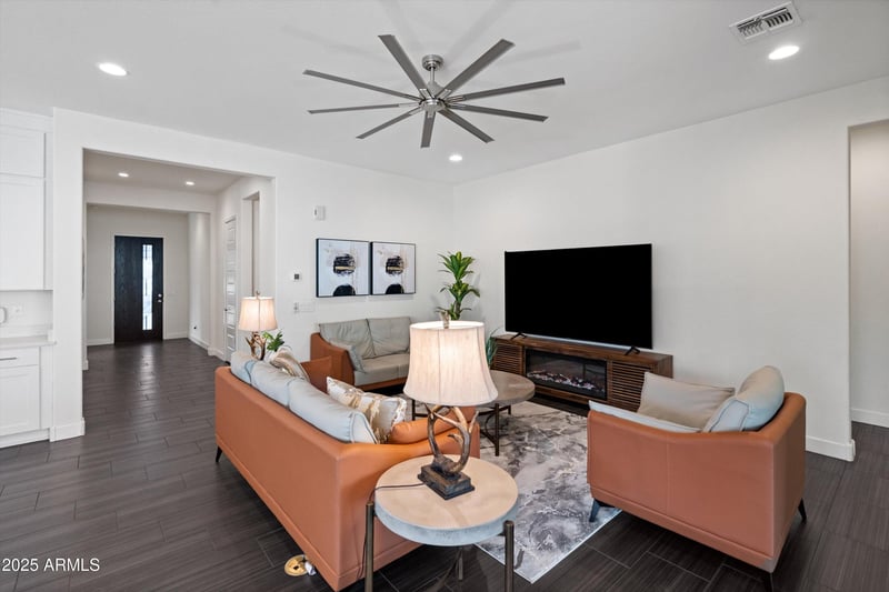 Listing details for 26205 106th Dr, Peoria, AZ 85383 : This stunning, fully upgraded home is truly turnkey and sold fully furnished-everything you see conveys, making it a rare move-in-ready opportunity. The property features a 2,527 sq ft main house with 3 bedrooms and 2.5 baths, plus a 292 sq ft 1 bed/1 bath casita ideal for guests or a private office. The open great room showcases three large multi-panel sliding doors for seamless indoor-outdoor living, opening to a covered patio and pergola with travertine flooring, putting green, and a high-end spa that will remain. The chef's kitchen offers ceiling-height cabinetry, an oversized island, built-in appliances, a butler's pantry with sink, and a spacious walk-in pantry. All bedrooms include walk-in closets, with a luxurious primary closet featuring custom shelving and an island. Corner lot with decorative front yard and ample parking for entertaining.