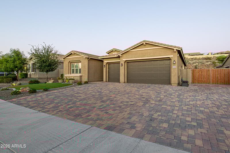 Listing details for 26261 106th Dr, Peoria, AZ 85383 : Manicured landscaping and a striking paver driveway create an unforgettable first impression at this exceptional home. An artistic metalwork screen door welcomes you inside to a bright, open-concept living space where the living room, dining area, and kitchen blend seamlessly. The living room features a dramatic accent wall and a wall of glass that opens to the backyard oasis, creating effortless indoor-outdoor living. The kitchen is both stylish and functional with rich wood cabinetry, granite countertops, apron sink, tiled backsplash, stainless steel appliances, an eat-in island, and a charming breakfast nook. The spacious primary suite offers a beautiful ensuite bath and a large walk-in closet. Two additional bedrooms, a full guest bath, and a versatile den with Murphy bed provide- flexibility for guests or a home office. Step outside to an expansive travertine patio with landscape inlays, two pergolasone with a built-in natural gas grillplus a fire pit and play area. The fully fenced backyard offers privacy with view fencing backing to a natural hillside. A gated, paved side yard is ideal for RV or extra vehicle parking, and the 3-car garage includes ample storage and workshop space.