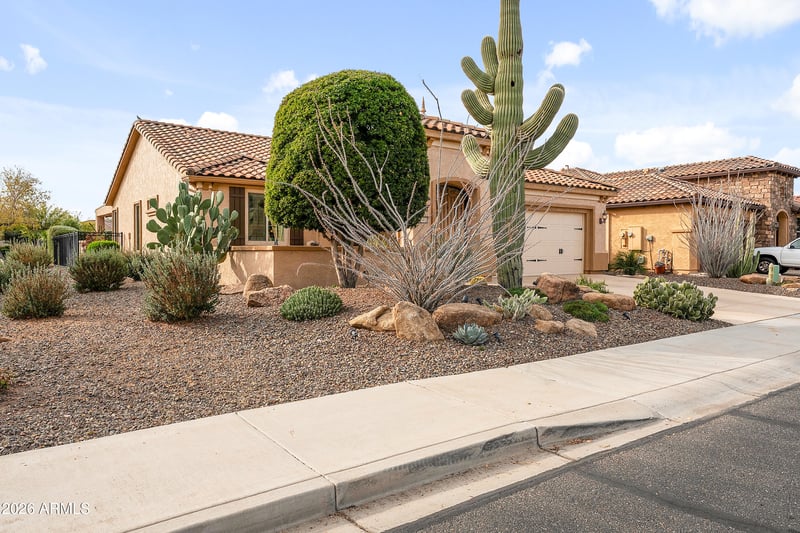 Listing details for 26405 Vista North Dr, Buckeye, AZ 85396 : Set on a premium view lot backing to open space w/sweeping tranquil views, this Sanctuary plan offers 3 bdrms & 2 baths w/exceptional privacy & refined desert living. Arched gate entry welcomes you into an extended front courtyard & through a custom glass-insert door. Interior highlights include 8-ft doors, graceful archways, upgraded tile floors, plantation shutters & owned solar. The expansive Great Rm is designed for relaxed elegance & entertaining, featuring a dramatic stacked-stone media wall, mantel, fireplace & impressive 12-ft dual sliding door. The chef's kitchen is both beautiful & functional w/KitchenAid apps, granite ctrs & backsplash, 5-burner gas cooktop, upgraded cabinetry, pendant & under-cab lighting, deep glide-out shelves, soft-close drawers/doors, pullout trash & extended dining area. The primary suite offers a serene escape w/bay window & spa-style bath w/barn-door entry, granite ctrs & tiled walk-in shower. Guest bath includes barn-door shower upgrade. Step outside to a private S-facing backyard retreat w/extended travertine patio, basalt water feature, fire pit, mature landscaping, power sun screen, pony walls & fenced yard perfect for sunset lounging, morning coffee or effortless entertaining. A 4-ft ext, insulated, climate-controlled garage w/epoxy floors, glass-front cabs & utility sink adds everyday convenience, while Sun City Festival's golf, resort amenities, clubs & vibrant active-adult lifestyle complete the experience.