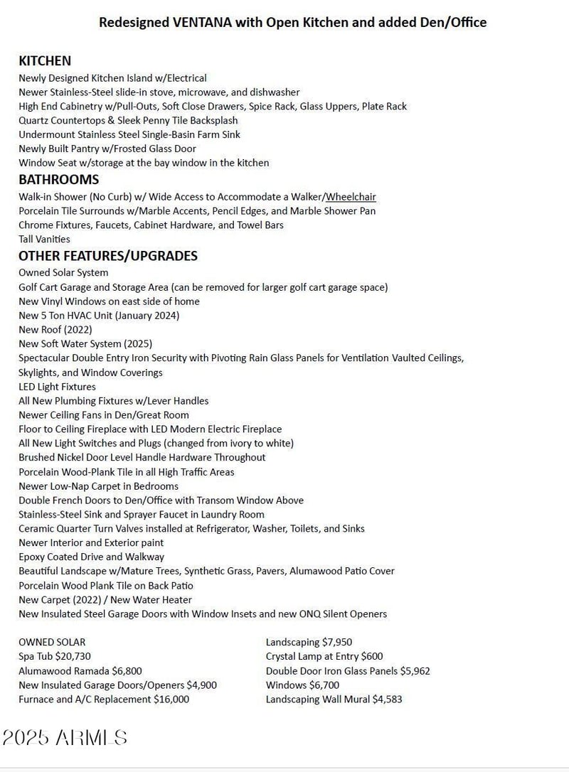 Listing details for 26434 Boxwood Dr, Sun Lakes, AZ 85248 : ONE OF A KIND GORGEOUS HOME! 2 Large Bedrooms, Den, 2.5 Golf Garage, OWNED SOLAR, Complete Interior Remodel with a RESORT-STYLE YARD! No expense spared, extensive list of upgrades including a 5-TON HVAC, NEW WINDOWS, NEW ROOF! Impressive Entry w/ Iron Rainglass Panels that open, Vaulted Ceilings, Open Concept, Light and Bright! Floor to Ceiling Fireplace. Designer Kitchen, Quartz Counters, Sleek Penny Tile Backsplash, Roll out Shelving, Pantry, Island for Entertaining, S/Steel Appliances. Wide Plank Porcelain Tile in Main Areas, Skylights, Oversized Bedrooms, Beautifully Remodeled Bathrooms with Marble Tile/Accents. Main Bedroom accesses Alumawood Patio w/Newer Spa & Changing Station. Resort Yard w/Synthetic Grass, Pavers, Lush Landscaping, Floral Mural (can be removed) POPULAR COTTONWOOD