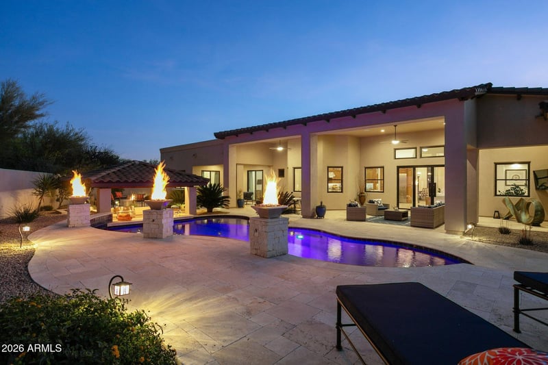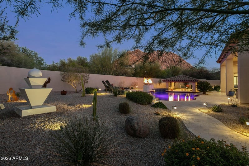 Step outside to a resort-style backyard designed for unforgettable entertaining. A shimmering Pebble Sheen saltwater pool with Baja shelf, swim-up bar seating, cascading water features, and dramatic fire elements creates a stunning focal point against the mountain backdrop. Expansive covered patios provide inviting outdoor living spaces overlooking the pool and Troon Mountain beyond. A show stopping sunken ramada outdoor kitchen features built-in BBQ, professionally constructed pizza oven, TV and bar seating--perfect for entertaining under the Arizona sky. Travertine patios, lush desert landscaping, citrus trees, and custom lighting complete the private desert oasis.
