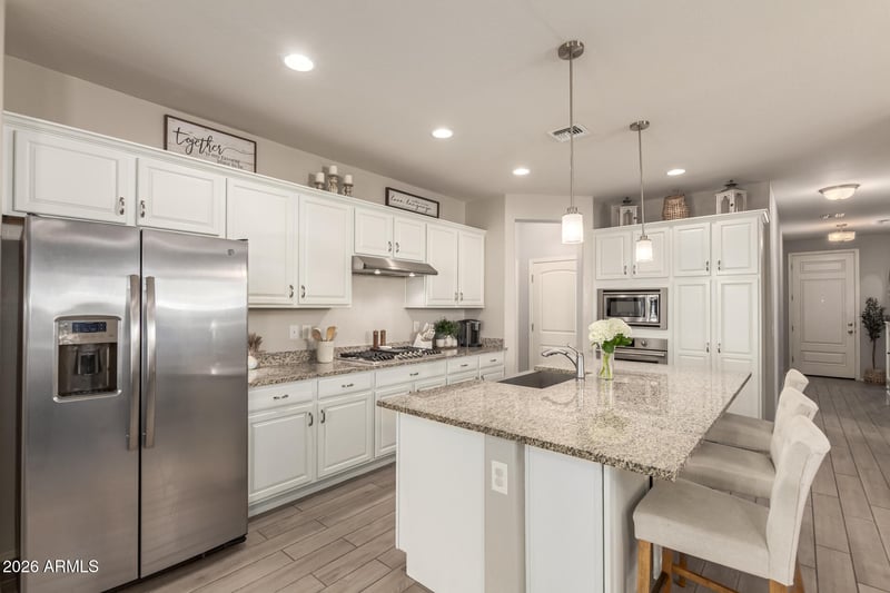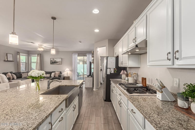 Listing details for 26533 122nd Dr, Peoria, AZ 85383 : Why wait on a new build when this one already did the upgrades for you? This upgraded home in a gated 85383 community delivers sweeping desert views without the long drive. Skip the dirt lots and delays! This one already has the value-added design center upgrades buyers want: a gourmet kitchen with gas stove, granite countertops, oversized farmhouse sink, extended island storage, tall crown-molded cabinetry, trash pullouts, and a built-in pantry. Thoughtful finishes continue with tile throughout the primary suite, upgraded carpet padding in bedrooms, added lighting, extra storage, upgraded doors and hardware, and a spacious laundry room with additional hanging space. The backyard is fully finished with turf and irrigation; ready for pets, play, and sunset lounging from day one. Low quarterly HOA, added high-end security door, dual-zone AC on a maintenance plan, Peoria schools, neighborhood park access, and quick access to Lake Pleasant Pkwy and Happy Valley shopping, dining, and entertainment. Move-in ready, value-packed, and the only home of its kind currently in the community. Close to 303 frwy, Trilogy Vistancia and TSMC-this home has it all! Luxury, comfort, and style, all in a fantastic location!
