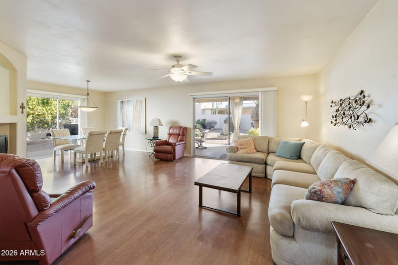 Listing details for 26609 Truro Dr, Sun Lakes, AZ 85248 : Charming 2BR, 2BA extended Shawnee model in the desirable active adult community of Cottonwood at Sun Lakes. Great curb appeal! Open great room with laminate flooring and dual sliders to the back and side patios. Functional kitchen with lots of cabinet and counter space, cabinet pull-outs, newer appliances and a cute little breakfast nook for your morning coffee. Guest suite with ensuite bathroom for maximum guest privacy. Primary suite extended 80sf with dual sinks, walk-in shower, walk-in closet, and slider to the patio. Mature backyard with multiple fruit trees and a raised garden bed. New windows throughout, new roof in 2020, AC 2022, and W/H in 2023. Start enjoying the amazing amenities of Cottonwood with golf, tennis, pickleball, pools, fitness, a great restaurant and so many clubs!
