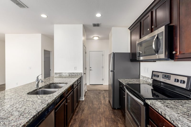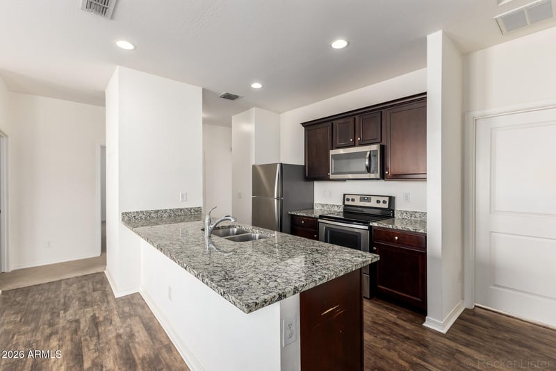 Listing details for 2665 Renegade Trl, San Tan Valley, AZ 85143 : Charming Single-Story Home in Rancho Bella Vista South! Well-maintained 3-bedroom, 2-bath single-level home featuring an open and functional layout. The kitchen offers upgraded stainless steel appliances, granite countertops, and 36'' espresso maple cabinets. Ceiling fans in every room, 2'' faux wood blinds throughout, and luxury plank vinyl flooring in all the right places enhance comfort and style.