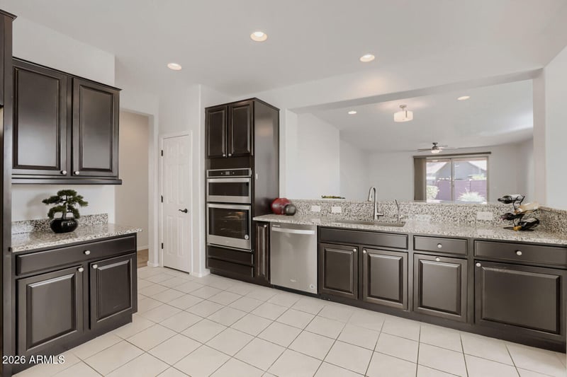 Listing details for 26975 71st Dr, Peoria, AZ 85383 : Highly upgraded newer construction on the largest lot in the subdivision! Situated on a 10,670 sq ft cul-de-sac lot with beautiful mountain views and a 10' RV gate. Thoughtfully finished with front and backyard landscaping, pavers, and a premium artificial turf putting green. The gourmet kitchen features upgraded cabinetry, granite countertops, a 36'' gas cooktop with hood, wall ovens, and stainless steel appliances. Spacious primary suite with large walk-in closet. Both bathrooms offer granite countertops, dual sinks, and walk-in showers. Additional upgrade includes 2' extensions at the rear of the home and a den in addition to the 3 Bedrooms. The extended garage measuring 23ft deep features epoxy flooring, built-in cabinets, water softener, and tankless water heater. Come check it out!!