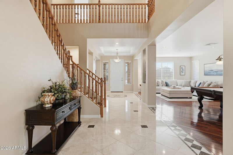 Listing details for 2722 Zion Way, Chandler, AZ 85249 : This two-story home offers comfort and thoughtful design throughout. Custom travertine and wood flooring create a warm, inviting feel. The first floor features a chef's kitchen with granite countertops, dual sinks, and a walk-in pantry, flowing into the family room with a gas fireplace. A full bathroom and versatile office or bonus room complete the main level. Upstairs includes generously sized bedrooms, a large loft, and a private primary retreat with a sitting area, fireplace, separate office, walk-in closet, dual vanities, and jetted tub. The three-car tandem garage with new epoxy flooring offers added storage and opens to the backyard. Enjoy a play pool with waterfall and covered patio, perfect for entertainment or relaxing. All of this located in a highly desirable neighborhood.