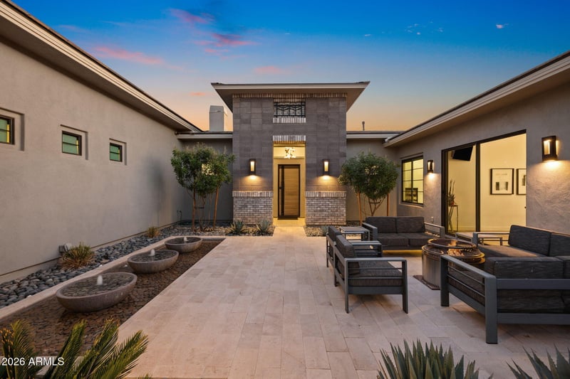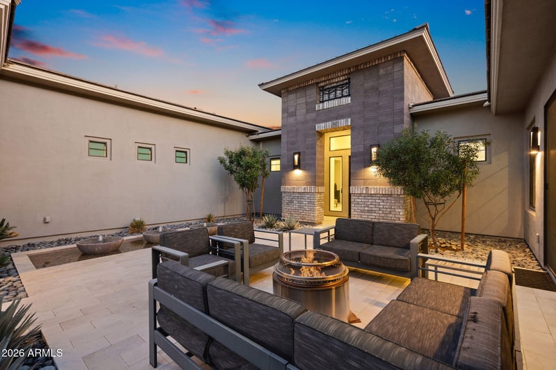 From the moment you arrive, the home makes a striking first impression. A grand entry and serene courtyard invite you in, setting a tone of privacy, elegance, and quiet luxury. Inside, soaring ceilings draw your eye upward while a custom-built fireplace and temperature-controlled wine room anchor the space creating an atmosphere perfectly suited for both intimate evenings and grand entertaining. At the heart of the home, the chef's kitchen is nothing short of spectacular. Dual waterfall islands, Wolf appliances, and impeccable finishes provide a space where culinary creativity can flourish and conversations naturally gather. The kitchen flows seamlessly into the family room, where premium surround sound and dramatic corner dual-stacking doors dissolve the boundary between indoors and out, allowing Arizona living to be experienced at its finest.
