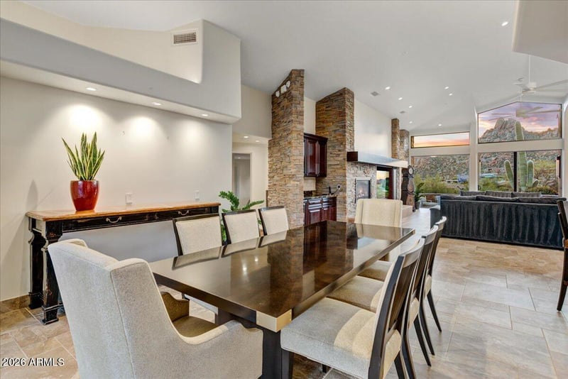 Listing details for 27267 103rd Way, Scottsdale, AZ 85262 : Contemporary, Frank Lloyd Wright-inspired single-level home located in one of Arizona's premier destinations, offering panoramic views of Pinnacle Peak and distant city lights. This thoughtfully designed residence features a desirable split floor plan, with the primary suite and two en-suite guest bedrooms plus a spacious den. Exceptional resort-style outdoor living area with extensive upgrades that spans both patios and desert landscaping. The front patio offers a new water feature and captures the evening sunset with unobstructed Pinnacle Peak views, while the backyard offers a new pool, outdoor kitchen, heated ramada and outdoor lounge, separate firepit overlooking dramatic natural rock outcroppings. Contemporary Frank Lloyd Wright-inspired single-level home located in one of Arizona's premier destinations, offering panoramic views of Pinnacle Peak and distant city lights. This thoughtfully designed residence features a desirable split floor plan, with the primary suite and adjacent office in one private wing, and two en-suite guest bedrooms plus a spacious den on the opposite side. Exceptional resort-style outdoor living area extensive upgrades that span both the front and back of the home with desert landscape. The front patio offers a new water feature and captures the evening sunset with unobstructed Pinnacle Peak views. While the backyard offers a new pool, outdoor kitchen, heated ramada and outdoor lounge, separate firepit and extensive hardscape overlooking dramatic natural rock outcroppings. A significant remodel completed in recent years includes new stone and wood flooring throughout, fully updated bathrooms with light, modern finishes and granite countertops, and a gourmet kitchen renovation with new appliances. Additional upgrades include a wine room, electrical enhancements and automated window shades Interior features include built-in speakers throughout, abundant skylights, a walk-in pantry, reverse-osmosis and soft-water systems, a separate wet bar in the great room, and patio access from every bedroom. Enjoy guard-gated privacy with convenient access to one of America's top-rated golf courses, as well as nearby hiking, dining, world-class resorts, and premier shopping in North Scottsdale.