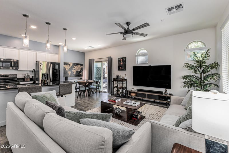 Listing details for 2736 Cavalier Dr #101, Gilbert, AZ 85295 : What a beautiful townhome in gated Val Vista Classic! Offering 3 beds, 2 baths + powder room, and a 2-car garage. The interior exudes refined style with tons of natural light, designer paint, recessed lighting, wood-look tile flooring in common areas, and Berber carpet in bedrooms. Designed for everyday living & entertaining, the seamlessly flowing open layout is sure to impress! The impeccable kitchen boasts black SS appliances, granite counters, white shaker cabinetry, and an island w/pendant lighting over the breakfast bar. All bedrooms await upstairs! The main bedroom has a large sliding window that opens to a Juliet balcony. If you want to relax, the patio awaits you with a fire pit! Community amenities include a pool, spa, and playground. Excellent Gilbert location! Home, sweet home!