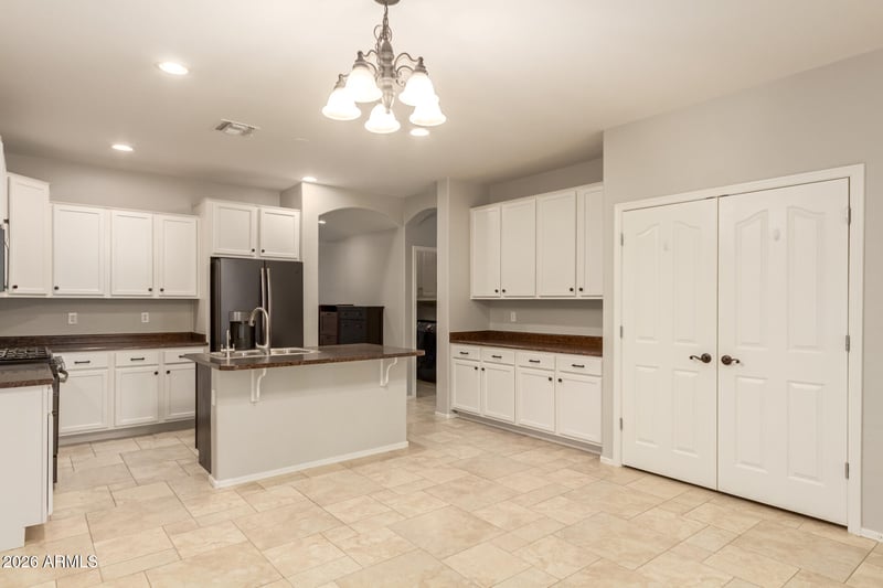 The kitchen is a standout, featuring abundant counter space, a large island, staggered cabinetry, and a walk-in pantry. Appliances have been updated in recent years and intentionally selected to coordinate, including an oversized refrigerator, extra-large microwave, quiet dishwasher, washer, and dryer—all included. The kitchen flows seamlessly into the main living areas, keeping everyone connected.