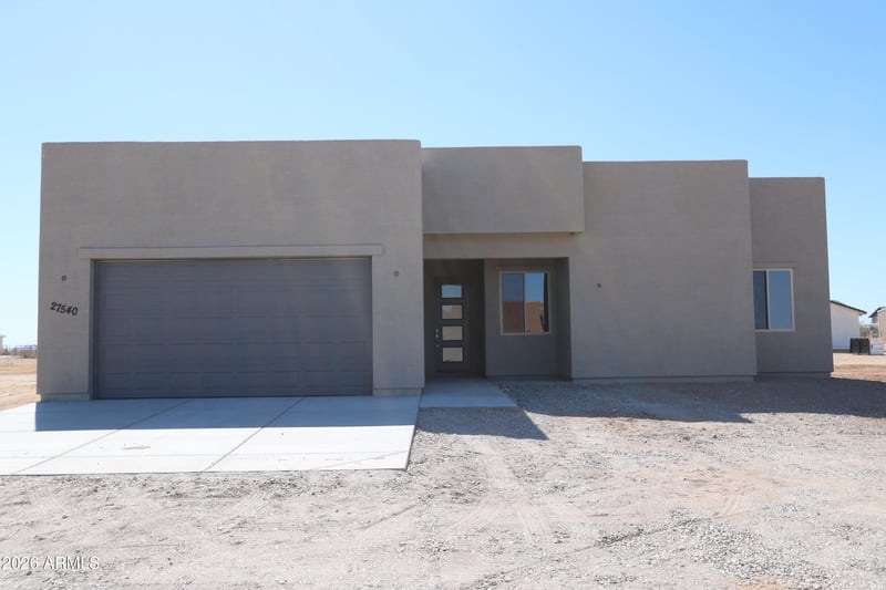 Listing details for 27540 255th Ln, Wittmann, AZ 85361 : Brand New home built to perfection! Home is open & bright and comes w a touch of contemporary finishes & custom front door. Kitchen is fantastic w/ island breakfast bar covered in level 3 granite or quartz (see pics) 2x6 exterior wall construction Anlin Windows, ''SIGA housewrap and tape system'' & loaded w many more upgrades. Bedrooms are spacious w/ master having walk in closet & w huge walk in shower. Fantastic floor plan w awesome mountain views to the north & south. Property is located around upscale site built custom homes w underground power, close to US 60 freeway access a 5 part shared well & No HOA! Others to choose from. HURRY! Bring you horses and your toys! Located in excellent area of Wittmann. Buyer can still choose interiors. Completion time approx 30 days