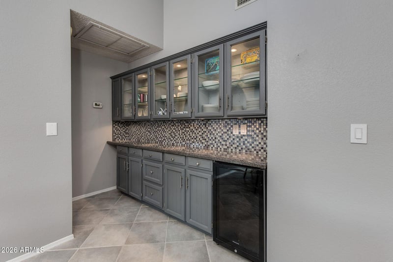 Listing details for 2763 Leisure World --, Mesa, AZ 85206 : Modern built in cabinetry in the dining area, with glass windows on the upper cabinets with a wine fridge.. Eye pleasing kitchen with oak cabinets, granite countertops and glass backsplash; eat in kitchen. Large living area with room for dining. Split floor plan & master bedroom has built in cabinets on one entire wall. Modern updates, this is a must see!