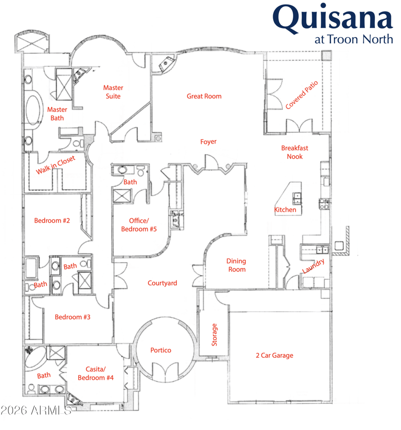 Listing details for 27721 110th Pl, Scottsdale, AZ 85262 : This model-perfect courtyard home delivers refined desert living in prestigious and gated Quisana at Troon North, adjacent to the Four Seasons Resort. Thoughtfully designed with an open and light-filled floor plan, the interior showcases oversized patterned stone tile flooring with custom accent details, rare recessed interior floor lighting, striking designer vanities, and statement light fixtures throughout. Elevated luxury touches include refrigerator drawers in the primary suite and direct access from the primary bathroom to the outdoor shower for a true spa-like experience. Set on an elevated cul-de-sac lot backing to natural open space, the property offers exceptional privacy and sweeping views of boulder outcroppings and Pinnacle Peak. The south-facing backyard is designed for entertaining and relaxation, featuring a large covered patio, jetted lap pool and spa, custom fire feature, view deck, outdoor shower, and built-in BBQ, perfect for enjoying Arizona's year-round outdoor lifestyle. At the heart of the home, the chef's kitchen features an oversized gathering island, Wolf appliances, a paneled Sub-Zero refrigerator, beverage center, and seamless flow to the adjacent formal dining room. A dramatic built-in wine gallery anchors the space, while double doors open to the private entry courtyard, creating an effortless connection between indoor and outdoor living. The tranquil courtyard is a destination in itself, providing abundant natural light to multiple rooms and offering a fireplace, soothing water feature, recessed floor lighting, and direct access to the private casita, ideal for guests, a home office, or multi-generational living. A large storage room enhances functionality and complements the spacious two-car garage with epoxy flooring.