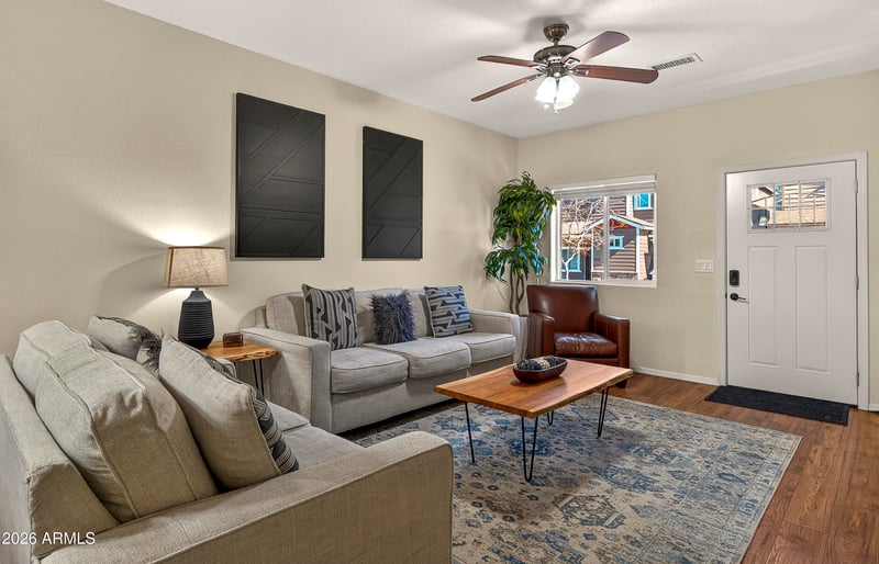 Listing details for 2809 Limestone Ln, Flagstaff, AZ 86001 : Tucked on a quiet loop in West Flagstaff's Presidio, this 3-bedroom, 2.5-bath home offers privacy, trail access, and a nearby park just moments away. The open-concept main level features engineered hardwood floors and a well-appointed kitchen with granite countertops, stainless appliances, and stained wood cabinetry flowing into the living and dining areas. Upstairs you'll find two guest bedrooms, a full bath, walk-in laundry, and a spacious primary suite with soaking tub and walk-in closet. Enjoy central A/C, a tandem 2-car garage, and a landscaped front and backyard. Perfect for a first-time home buyer, investor, or 2nd home to escape the phoenix heat. Schedule your private showing today.