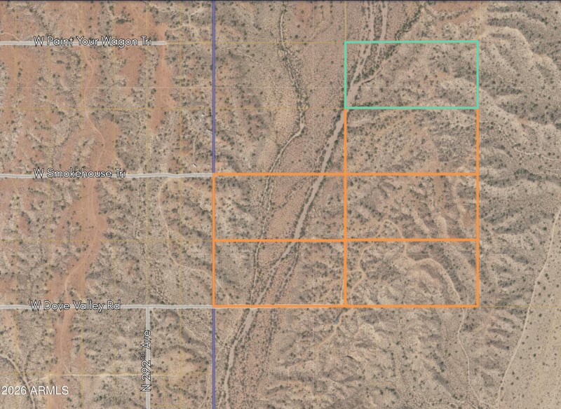 Listing details for 280XX Dove Valley Rd #6 Parcels, Wittmann, AZ 85361 : Builders and developers! Rare package of six abutting 20-acre parcels on the east side of Whispering Ranch. Located in an unincorporated area & optimally positioned just across the Hassayampa River from a significant privately held land area in Buckeye. Festival Ranch is just 7 miles south on Sun Valley Parkway. The south and west boundaries are on a section line, with the south boundary planned to be a 4 lane road, Dove Valley Parkway. A portion of the property is flood zone impacted, but most is not. Sellers will consider financing with the right offer. Secure your investment before values in the Northwest Valley rise any further.