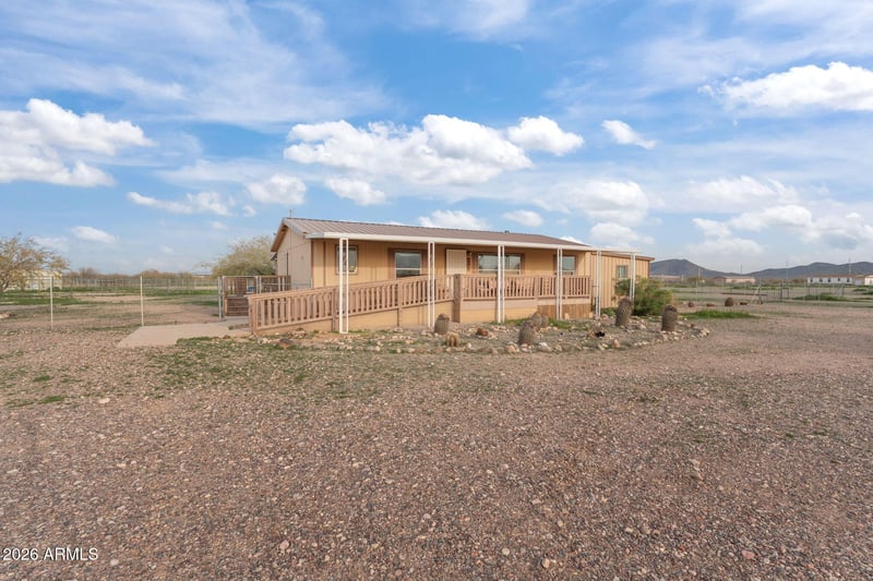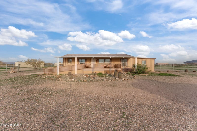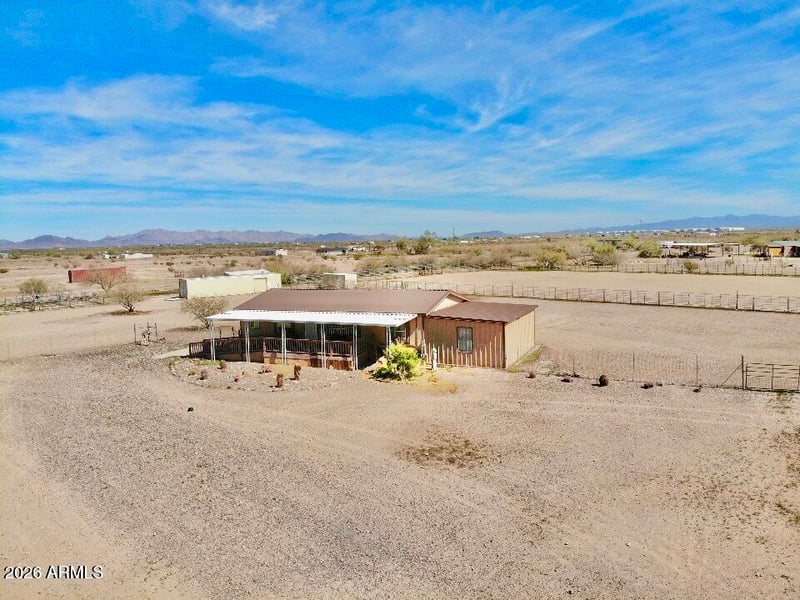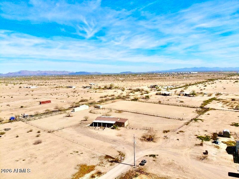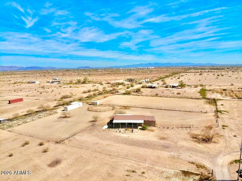Equine improvements include eight 14' x 30' pipe stalls, a 160' x 305' roping arena, a round pen, and two steer pens. The arena is designed for horseback operation with gates that open and close without dismounting. A 3,500-gallon tank, oversized pump, Rain Bird water system, and extended sprinkler heads allow the entire arena to be watered in approximately 36 minutes. Sellers have hauled in significant sand to elevate footing and enhance usability. Perimeter no-climb fencing surrounds the property... Two storage containers (8.5' x 20' and 8.5' x 53') offer space for tack, tools, or seasonal storage. The layout provides privacy, room for trucks and trailers, and direct function for ropers, barrel racers, or anyone seeking usable ground with improvements already in place. The property is approximately 30 minutes from Buckeye Equestrian Center and about 50 minutes from Wickenburg.