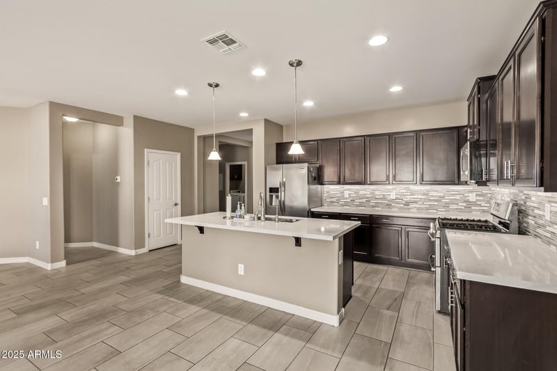 Listing details for 28273 Welton Pl, San Tan Valley, AZ 85143 : This stunning 3 Bed/2 Bath residence enjoys a prime location within the desirable Johnson Ranch community and offers exceptional appeal throughout. It features an extended driveway, a built-in mister system, sun screens and low-maintenance landscaping. The back patio with ceiling fans provides a comfortable space for outdoor living and entertaining. The kitchen showcases white quartz countertops, a stylish tiled backsplash, a gas range, and generous cabinet storage. A large island with a sink and breakfast bar opens to the spacious living area, creating an ideal setup for gatherings .The primary suite features a walk-in shower and an oversized walk-in closet.