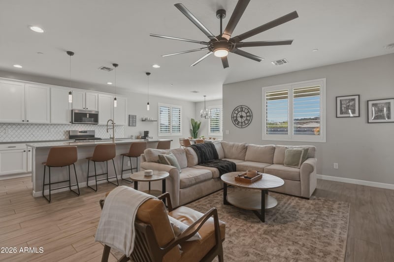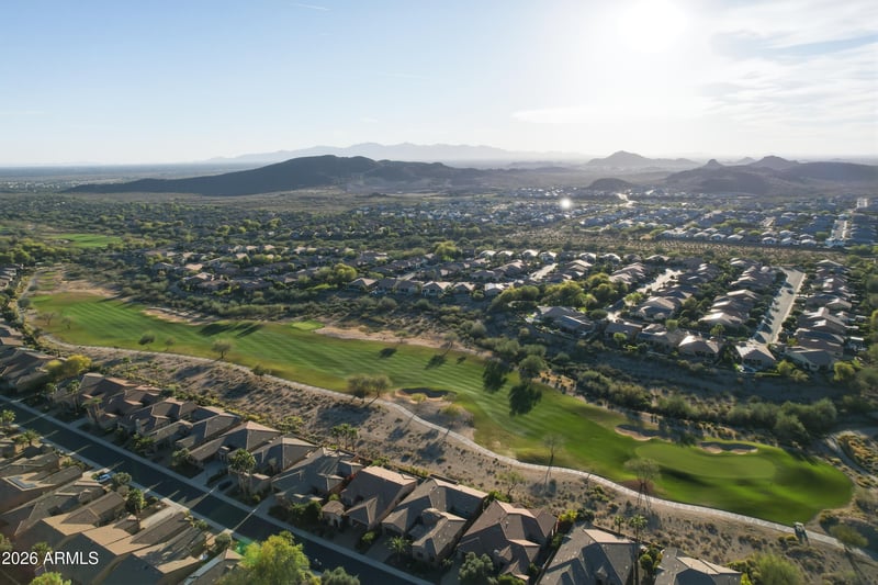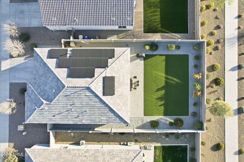 Listing details for 28720 132nd Ln, Peoria, AZ 85383 : Stunning North Peoria solar-powered (OWNED) home showcasing exceptional upgrades and breathtaking views. This open-concept floor plan features a spacious great room with a split-bedroom layout, accented by elegant wood-look tile flooring, high baseboards, plantation shutters, and ceiling fans throughout. The beautifully appointed kitchen offers white shaker-style cabinetry, quartz countertops, designer tile backsplash, stainless steel gas appliances, a walk-in pantry, and a large island with undermount sink and pendant lighting--ideal for both daily living and entertaining. The sliding glass door opens to an extended paver patio with a natural gas stub for grilling. The backyard is truly special, offering sweeping hillside and mountain views, dramatic desert skies, and exceptional privacy with no rear neighbors. Finished with low-maintenance artificial turf, this space is both serene and visually striking. The primary suite is a peaceful retreat featuring an en-suite bath with dual-sink vanity, an oversized walk-in shower with upgraded decorative tile, and a spacious walk-in closet. Additional highlights include a water softener, garage service door, electric vehicle charging equipment, and a fully owned, paid-in-full solar system that conveys with the property, delivering impressive energy efficiency and long-term savingsno lease or loan to assume. Community amenities include walking trails, bike paths, playground, basketball court and picnic ramadas, all within the Peoria Unified School District. Neighborhood is next door to Trilogy Golf Club at Vistancia - a public 18-hole, par-72 championship golf course. Conveniently located just 15 minutes from Lake Pleasant, offering endless opportunities for outdoor recreation and water activities.