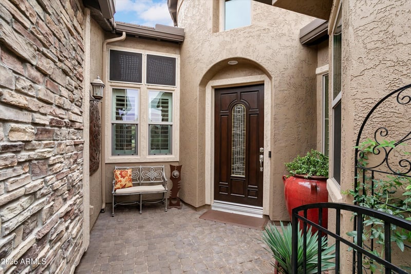 Listing details for 28743 127th Ave, Peoria, AZ 85383 : 'RESORT' BACKYARD OASIS ON GOLF COURSE with heated POOL AND SPA. Stunning 'Stellare' ideal for indoor/outdoor entertaining and enhanced with MANY thoughtfully added updates beginning in 2021 including OWNED SOLAR! This elegant award-winning floor plan has soaring 12' CEILINGS, an expansive great room, gourmet kitchen with large morning room, 3 ENSUITE BEDROOMS plus half-bath, den & 2+1 garages, NO CARPETING. With golf views & dramatic SUNRISE & SUNSET views the backyard features a covered & a huge extended patio-both w/pavers, travertine pavers surrounding the pool w/waterfall & spillover spa, built-in BBQ island w/new Grand Turbo gas BBQ-2025, misters, custom landscaping & wrought iron fence. Extended side paver courtyard off the great room provides more outdoor living. Spacious chef's dream kitchen with extensive cabinetry & counter space, deluxe granite slab on counters & large island, GE Monogram stainless built-in appliances with five-burner cooktop surrounded by a focal-point decorative designer vent hood to the ceiling and a relaxing morning room surrounded with windows and a sliding glass door to the patio. Enjoy breakfast or morning coffee outdoors. The 38' long great room with an area for dining and sliding glass doors to the patio features a beautiful wet bar with seating & beverage refrigerator. The primary suite is spectacular with access to the side courtyard and paver path to the backyard, bay wall in the bedroom, attractively finished five-piece bath including jetted soaking tub & huge walk-in closet. The two attractive on-suite guest bedrooms and half bath are in a separate wing of the house. Updates since 2021 include OWNED SOLAR (9.84kW-average electric bills $63/month for past 12 months), two HVAC systems, mini-split in main garage, cabinets added to laundry room and both garages, tankless hot water heater, Hunter Douglas silhouette sheers, clearstory window coverings on remotes, custom window treatments, pergola over side courtyard, deluxe closet organizing system in primary suite, sunshade covering the pool equipment, door on den, & ceiling fans. Here is YOUR SPECTACULAR HOME. Located in award-winning gated, 55+ Trilogy at Vistancia with 5-star-resort style amenities at the 35,000 SF Kiva Club with indoor & outdoor pools, fitness center, day spa, cafe, billiards, meeting rooms, library, tennis courts, pickle ball, bocce ball, events & a plethora of activities to choose from. Outstanding Gary Panks-designed golf course is woven throughout the neighborhood. The Mita Club has additional community amenities. Easy access from Trilogy to the 303, shopping, restaurants, entertainment, Lake Pleasant & Paloma Park.