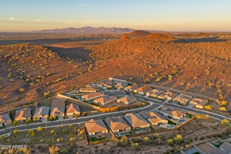 Listing details for 29055 136th Ln, Peoria, AZ 85383 : Privately tucked on a quiet hillside cul-de-sac, this newly built home impresses with an extended driveway and spacious 4-car garage. A welcoming courtyard leads into a thoughtfully designed split floor plan with soaring 10-foot ceilings and a bright, open great room--ideal for entertaining and everyday living. Oversized sliding doors create seamless indoor-outdoor flow to a beautifully landscaped backyard featuring a covered patio, pavers, turf, and lush greenery. The chef's kitchen shines with a large island and stylish finishes. Two flexible bonus rooms offer space for an office, gym, media room, or more. The home includes two en suite bedrooms with large closets, plus two additional bedrooms, a full bath, and powder room. Assumable VA loan available (VA buyers only).