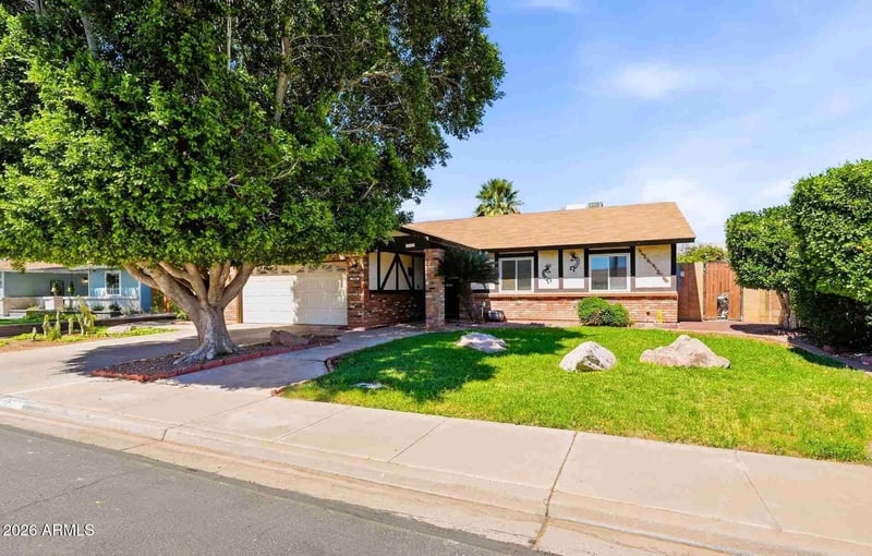 Listing details for 2908 Concho Ave, Mesa, AZ 85204 : Ranch-style, 4-bedroom, 2-bath home located in the Meadowgreen subdivision near Lindsay & Broadway in Mesa. Property offers approximately 1,586 sq ft on a 6,993 sq ft lot with no HOA. Features include dual-pane windows, brick fireplace, and bay windows in the eat-in kitchen. Backyard includes a pebble-finish pool and spa, custom landscaping, and a covered patio. North/south exposure. Mature landscaping with front and back irrigation system and grass front yard. Oversized garage with built-in cabinets. Refrigerator, washer, and dryer convey. Outdoor space includes pool, spa, and covered patio suitable for entertaining. Convenient location near schools, parks, shopping, and freeway access.