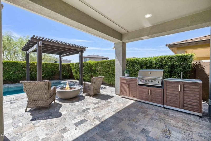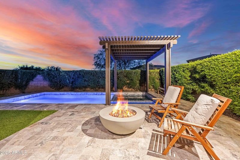 Listing details for 2909 Sands Dr, Phoenix, AZ 85050 : Rare opportunity to own a 5-bedroom pool home in sought-after Sky Crossing, perfectly positioned beside a greenbelt and park with only one side neighbor and no homes behind. The private backyard lives like a resort retreat, where a heated pool and spa, pergola lounge, fire-pit gathering area, outdoor kitchen, turf, and silver travertine create an ideal setting for relaxing or entertaining under the Arizona sky. Lightly lived in as a seasonal residence, the home feels fresh and beautifully maintained with two spacious living areas and two en-suite bedrooms that offer flexibility for guests or multigenerational living. Recent upgrades include light oak flooring, new A/C (2025), upgraded pool equipment, EV charger, and epoxy garage flooring. Residents enjoy Sky Crossing resort amenities.