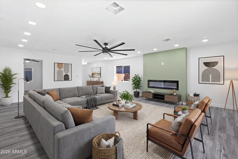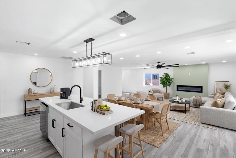Listing details for 2914 81st Ave, Phoenix, AZ 85033 : NO HOA! Recently renovated 4 bed, 2 bath home offering modern style and an open, spacious layout. The stunning kitchen features white shaker cabinets, quartz countertops, subway tile backsplash, stainless steel appliances, and a large island perfect for entertaining. The bright living area includes luxury flooring, recessed lighting, a statement ceiling fan, and a sleek modern fireplace. Bathrooms are beautifully upgraded with designer tile, a walk-in shower, and contemporary finishes. Step outside through sliding glass doors to a spacious backyard ready for your personal touch. A move-in ready home combining modern design with comfort and functionality.
