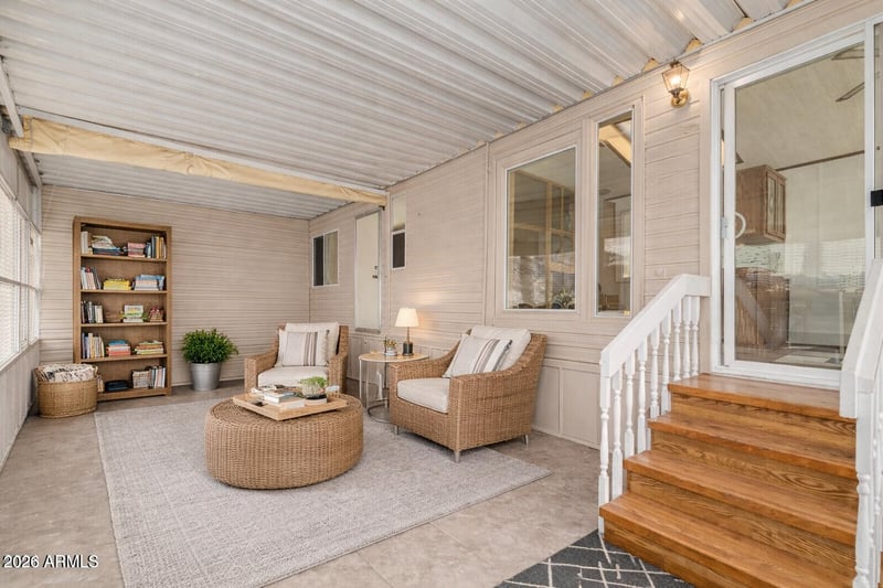 Listing details for 2920 Cree Dr, Apache Junction, AZ 85119 : Step into this beautifully maintained & fully furnished 1-bedroom, 1-bath home featuring an enclosed, air-conditioned Arizona room that expands your living space to approximately 800 sq. ft. — complete with a guest sleeping area and privacy curtain for visitors. Inside, enjoy a bright, open layout with a stylish kitchen showcasing a glass tile backsplash and plenty of storage. The spacious utility room includes a washer, dryer, sink, and shelving for convenience. Outside, take in the mountain and golf course views, and soak up the Arizona sunshine. A quiet location near the 16th Ave exit makes coming and going a breeze, and two-car parking adds extra ease. Located in a land-owned, active 55+ resort community, this home offers resort-style amenities that make every day feel like vacation: 9-Hole Golf Course