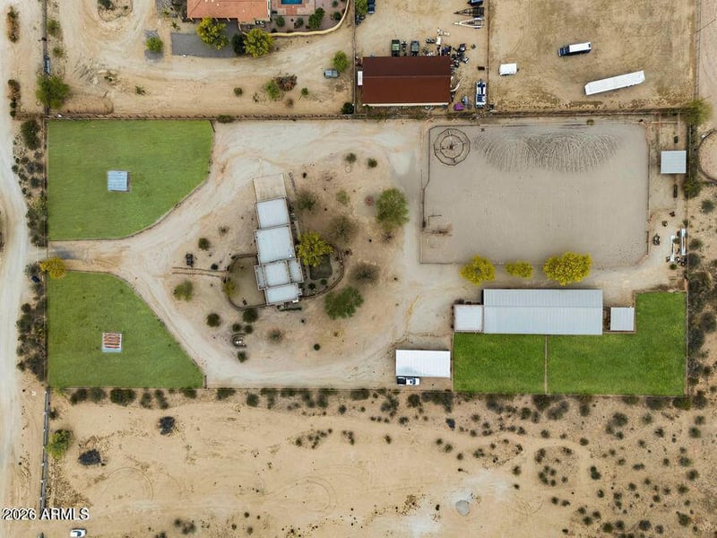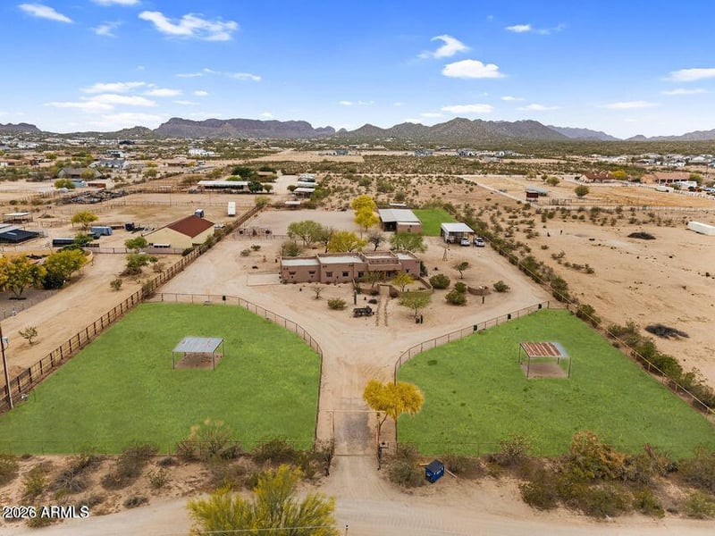 Listing details for 29204 Bryce Trl, San Tan Valley, AZ 85144 : Custom home on 4.1 acres w/ serious horse setup fully fenced w/ electric entry gate. 6 stalls 24x16 (auto water, fans, programmable lights, mangers), roping arena w/ lights & 5-head sprinkler system, cattle pen, hot walker, turnouts, hay barn, tack room w/ water, sink & toilet. Wash rack, RV hookups (30 amp, water, septic). Shop has sep. panel, air piping—compressor conveys. House offers large closets & large bedrooms, 2 propane fireplaces (LR & Primary BR), smooth texture walls, surround sound, Ecobee thermostats, Ring cam, ADT owned, intercom t/o, & USBs in every room. Kitchen has knotty alder cabs & Moen wave faucet. Cowboy touches t/o; vega beams, wood doors & windowsills, custom vents & adobe block. Garage fits a dually truck & features MyQ openers & cabinets. NEW well & NEW AC Unit!