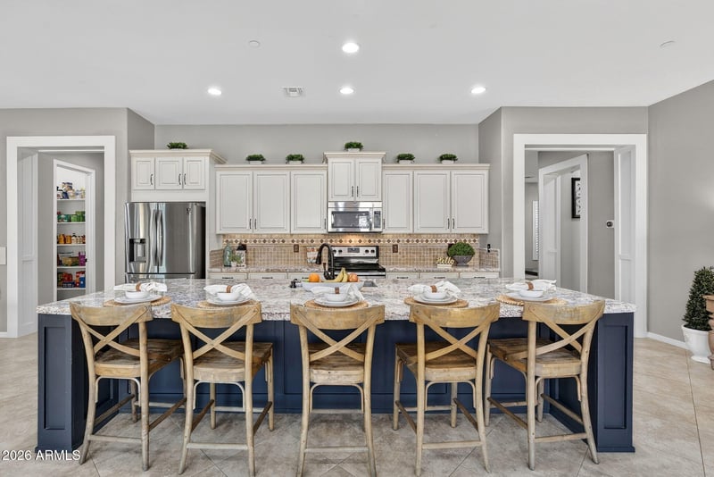 Listing details for 2926 Wyatt Way, Gilbert, AZ 85297 : Spacious 5 bed, 4 bath two-story with rare downstairs bedroom and full bath, perfect for guests or multigenerational living. Open kitchen flows into a large family room and features granite counters, oversized island seating 5, staggered cabinets, butler's pantry, walk-in pantry and detailed custom woodwork throughout. Separate movie room, formal living and dining, plus an oversized laundry room downstairs. Massive loft upstairs offers flexible living space. Backyard includes pool, lush turf and extended covered patio. 3-car garage. Prime Gilbert location near Discovery Park, Gilbert Regional Park, SanTan Village and Loop 202 access.