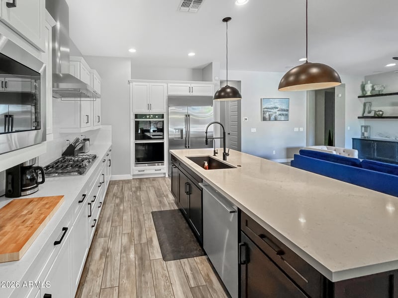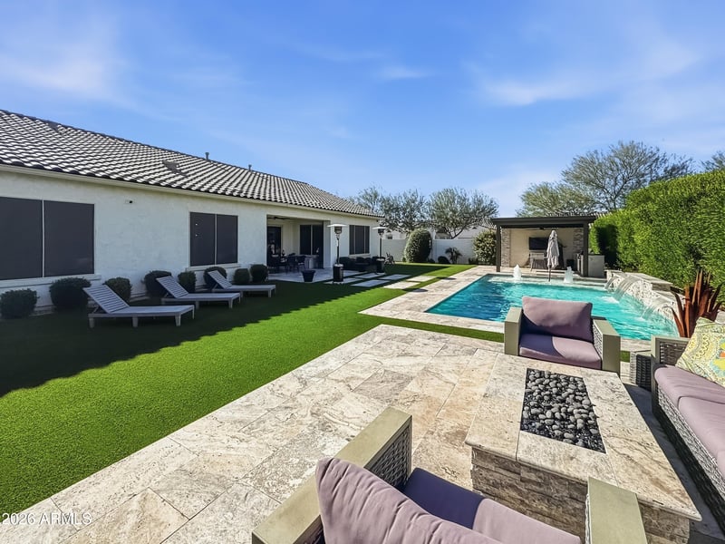 Listing details for 2930 Herrera Dr, Phoenix, AZ 85050 : Welcome to resort-style living in the gated Astarea at Sky Crossing. This stunning single-story home sits on a premium corner lot and features a bright, open floor plan with natural light and a chef's kitchen that shines with upgraded stainless-steel appliances and flows effortlessly into the main living area with custom built-ins. Offering four bedrooms plus an office/den and a peaceful primary suite, the layout is both functional and inviting. Step outside to your private backyard oasis with a sparkling pool with new heater, gas fire pit, and covered outdoor kitchen under a pergola—perfect for entertaining year-round. Additional upgrades include a new reverse osmosis system. Enjoy access to community pools, parks, and a fitness center, just minutes from shopping, dining, and freeways.