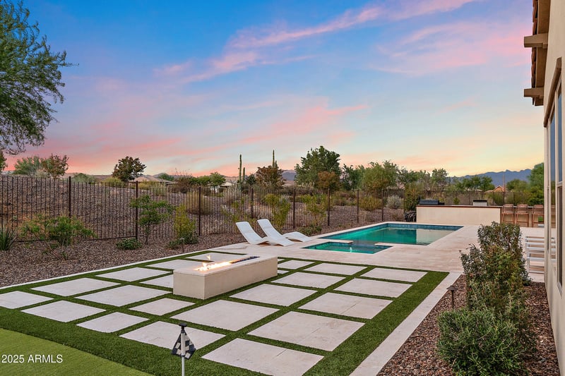Listing details for 29348 Clear Ridge Rd, Rio Verde, AZ 85263 : Experience luxury desert living in the exceptional Trilogy at Verde River community! Skip the wait for new construction — this professionally designed, fully customized home is brimming w/ high-end upgrades & lives like brand new. Perfectly positioned on a premium lot showcasing stunning desert scenery & breathtaking views. Every detail has been thoughtfully curated - warm neutral palette, elegant hardwood flooring, designer lighting fixtures & soaring ceilings enhanced by customized beams. Open-concept kitchen, living & dining boasts expansive layout & 20ft multi-panel sliding door, creating a seamless indoor-outdoor transition to resort-style backyard. Chef's kitchen showcases Modern Mocha lighted cabinetry, stainless-steel GE Profile appliances, XL quartz waterfall island w/ seating, walk-in pantry w/ wood barn door & whole-home water filtration & purification system. Primary w/ 5-pc bath & upgraded walk-in closet w/ built-in storage + 2 additional en-suite bedrooms. Step outside to your personal oasis featuring Pebble Sheen pool & spa, artificial turf w/ putting green, fire pit, built-in BBQ & smoker & custom stone pavers perfect for entertaining or relaxing in style. Extended 3-car garage offers an EV charging outlet, ceiling storage racks & epoxy floors. Enjoy community amenities including the Tom Lehman-designed golf course, tennis & pickleball courts, poolside bar & grill + & stunning resort pool w/ panoramic views of Weaver's Needle. Club offers fine & casual dining, exclusive Afturburn fitness center, Alvea Spa + more. The perfect blend of comfort, style, & functionality inside & out!