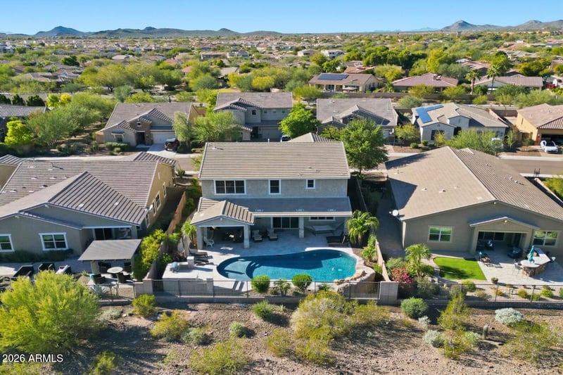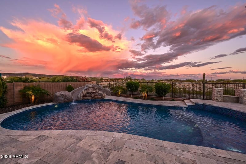 Listing details for 29419 119th Ln, Peoria, AZ 85383 : Welcome to this meticulously cared-for 3,674 sq ft luxury residence offering 4 bedrooms, 3.5 baths, a 3-car garage, large office, and spacious loft. A paver driveway sets the tone as you enter a home designed for elevated living and seamless indoor-outdoor entertaining. The great room features a dramatic multi-slider opening to a resort-style backyard with extended covered patio, gas fireplace, stone entertainment wall, raised BBQ island area, expansive pool with rock waterfall and slide, and extended travertine patio. View fencing frames breathtaking desert vistas. The gourmet kitchen showcases new two-tone quartz countertops, custom cabinetry, and subway tile backsplash. Wood flooring, designer finishes, and $42K in recent upgrades and updates complete this exceptional home! +3,674 sq ft | 4 Bedrooms | 3.5 Bathrooms +3-Car Garage with Paver Driveway +Large Private Office + Spacious Upstairs Loft Interior Features: -Great Room with Multi-Slider to Covered Patio -Surround Sound in Great Room & Loft -Gourmet Kitchen with New Two-Tone Quartz Countertops -Two-Tone Cabinetry with Custom Hardware -Subway Tile Backsplash -Beautiful Wood Staircase -Wood Flooring Throughout -Walk-in Closets & Carpet in all 3 Guest Bedrooms -Tile in Bathrooms -Spacious central Loft upstairs -Wood Shutters Throughout (except rear main-floor windows) -Wainscoting in Owner's Entry & Dining Room -Barn Door in Primary Suite -Large Primary Closet Resort-Style Backyard: -Extended Covered Patio -Gas Fireplace & Stone Entertainment Wall -Raised BBQ Island -Large Pool with Water Feature, Rock Waterfall & Slide -Extended Travertine Patio -View Fencing with Gorgeous Desert Vistas Additional Notes: -Home Shows Like a Model -Meticulously Maintained -$42,000 in Upgrades and Updates Added by Current Owners -Epoxy Garage floors -Central vac system -Reverse osmosis -New maintenance free water system