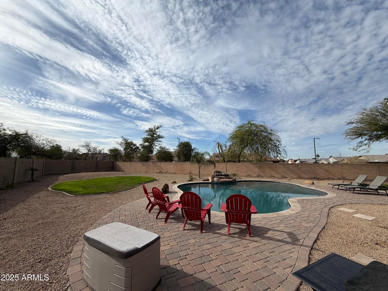 Listing details for 2946 161st Dr, Goodyear, AZ 85338 : The one you've been waiting for! Four bedroom/three full bath with Huge 12,709 SF LOT! Custom pebble tech pool, travertine coping, relaxing waterfall with belgard pavers Grass islands for kids, pets & family outings! Formal living/dining room at entry. One bedroom and a FULL bath downstairs! RECENT Updates throughout! Fabulous wood like tile 2020. New carpet, fans, interior paint & blinds 2021. Upgraded lighting throughout. Gorgeous kitchen with modern cabinets, upgraded appliances, granite counter tops/breakfast bar island, smart recessed lights & walk in pantry. Eat in kitchen breakfast room looks out to the patio/pool! Kitchen opens to large family room. Huge Master Bedroom retreat will awe you! 2024 Remodeled Master bath with dual vanity sinks, soaking tub, shower & cabinets galore Huge master walk in closet. Loft retreat upstairs which is a great third living area/flex room for family! Beautiful wood rail staircase. Huge laundry room big enough for washer/dryer and fridge! Great location! Close to shopping, grocery, restaurants, Goodyear Civic Center, golf and Goodyear spring training. Easy access to interstate 10 and the 303! Plenty of extra improvements such as RV gate, sun screens, smart ecobee thermostat, newer security screen door. Smart lighting in Kitchen, Living room and Master Bathroom. This is a very well kept home that shows pride of ownership. Check out all the pics! Tesla Solar panels is a per month "subscription" not a lease. Buyer to have subscription transferred into their name upon closing. Gas heat, gas hot water.