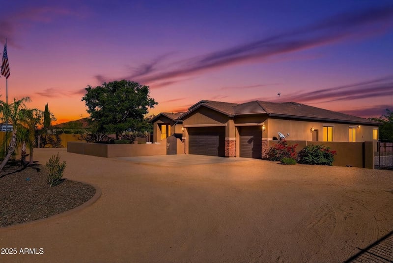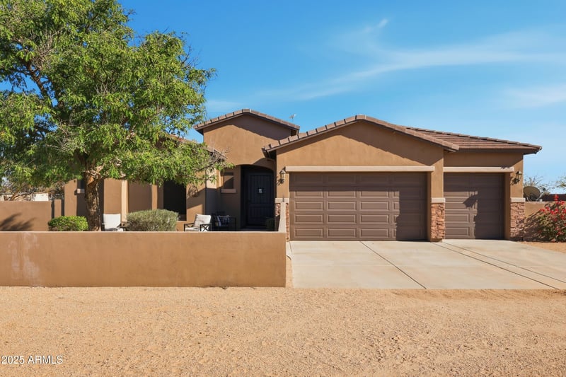 Listing details for 29619 259th Ave, Wittmann, AZ 85361 : Country living at its best! This spacious 5-bedroom, 3-bath custom estate sits on 1.24 fully fenced acres in the peaceful Wittmann community, with no neighbors behind, State Trust land across the street, and beautiful mountain views. Designed for comfortable living and entertaining, the home offers a split floor plan, 10-ft ceilings, plantation shutters, granite countertops, 20x20 tile flooring, central vacuum, and abundant natural light. The generous primary suite features a spa-style bath with jetted tub, dual-head custom shower, and oversized walk-in closet. The chef's kitchen includes a large granite island, white cabinetry, breakfast nook, and formal dining. Outdoor living shines with a sparkling pool, cool decking, mature landscaping, and ample space for horses, a barn or corral. Additional highlights include five RV hookups, a 3-car garage with built-ins and epoxy floors, nearby ATV and horse trails, exterior paint completed in 2025, and the serenity of wide-open desert livingjust minutes from town conveniences.